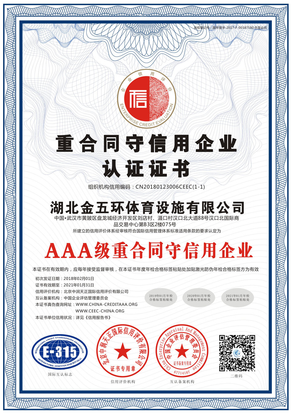 湖北金五环体育设施有限公司荣获AAA级重合同守信企业,2018年02月中国信用行业颁发AAA级重合同守信企业证书,诚实守信携手共创未来