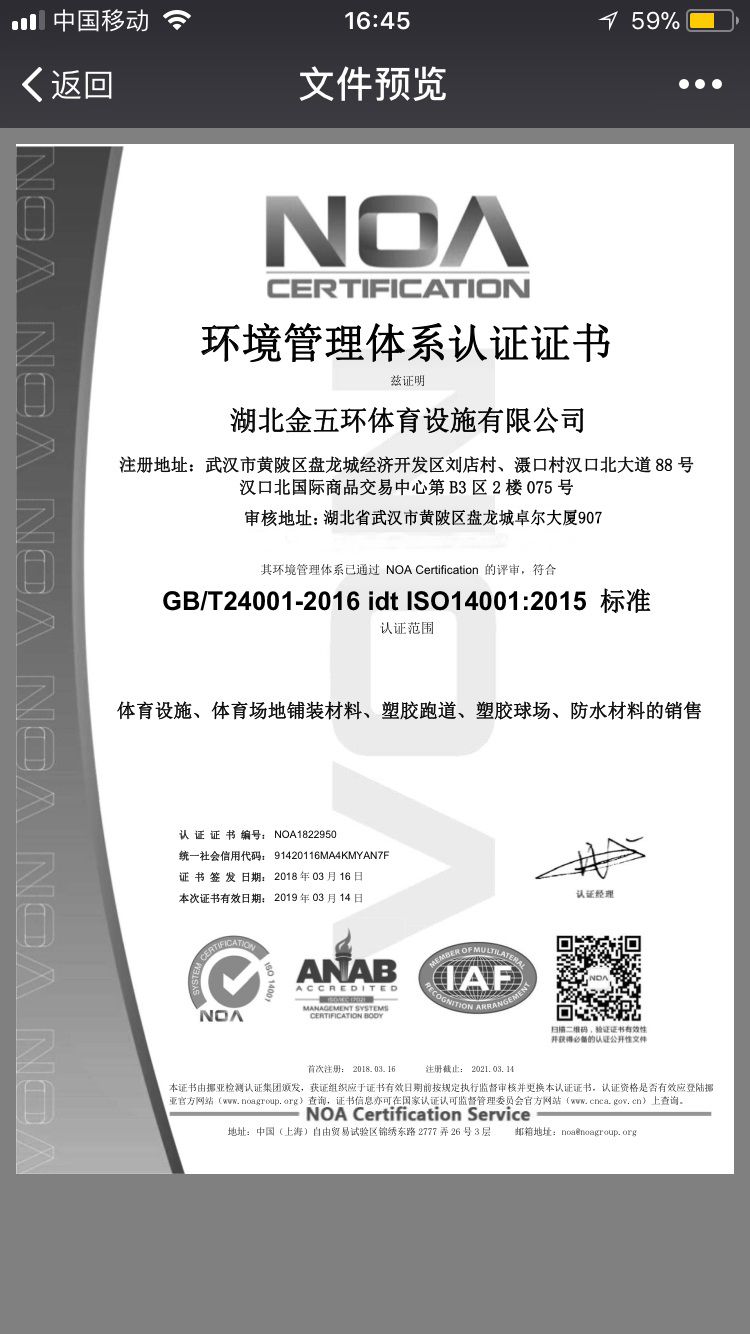 湖北金五环体育设施有限公司荣获环境管理体系认证证书卓尔大厦907,GB/T24001-2016 idt ISO14001:2015标准 体育设施、体育场地铺装材料、塑胶跑道、塑胶球场、防水材料的销售