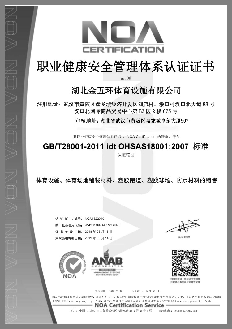 职业健康安全管理体系认证证书卓尔大厦907,GB/T28001-2011 idt OHSAS18001:2007标准 体育设施、体育场地铺装材料、塑胶跑道、塑胶球场、防水材料的销售